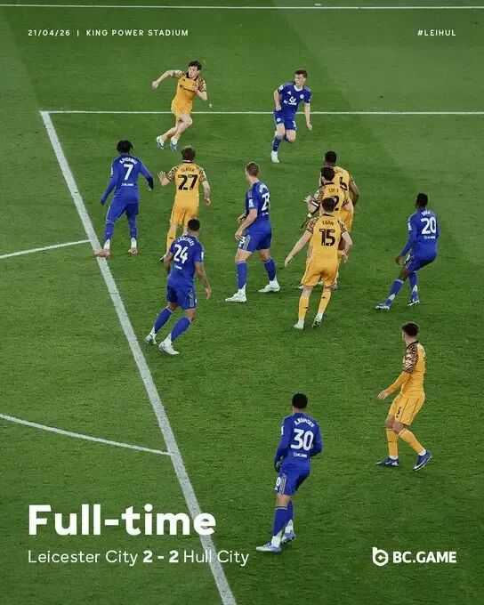 英冠第44轮,莱斯特城在主场王权球场2-2战平赫尔城,正式降入英甲。